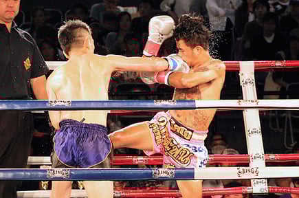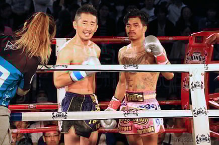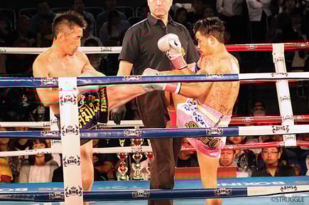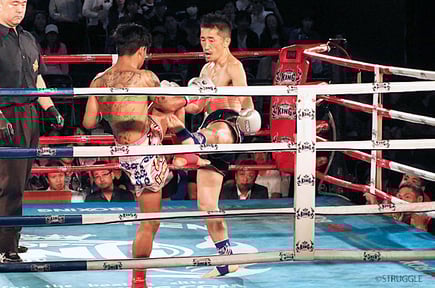 ハッキリとした差はないものの、ローキックでダメージを与える松崎、前に出てくる松崎に前蹴りを多用していくバンサパン選手。