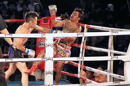 ムエタイテクニックを駆使して攻める松崎、はぐらかしながらポイントを押さえるように隙を狙って攻撃してくるバンサパン選手。