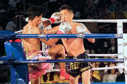 組み膝と肘の打ち合いでは互いに譲らずの展開。