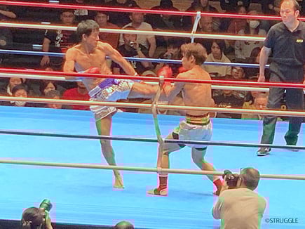 1R、大崎の左ストレートと左ミドルキックがキレイに当たる。