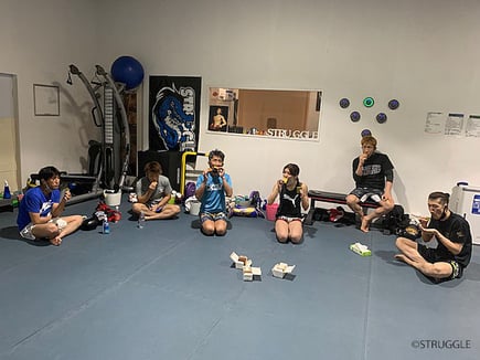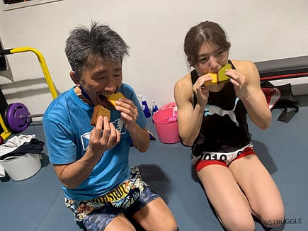 練習後、いただきもののカステラをバクバク食べるまっちゃんぱんちゃんでした。