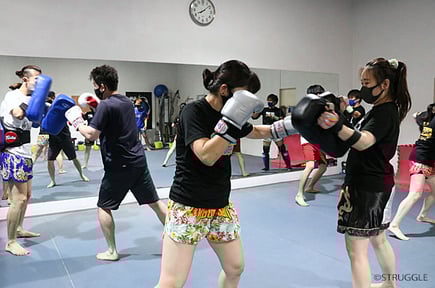 前半はパンチングミットを使ってウォーミングアップテクニック。