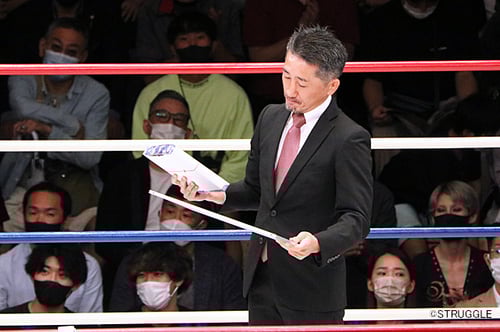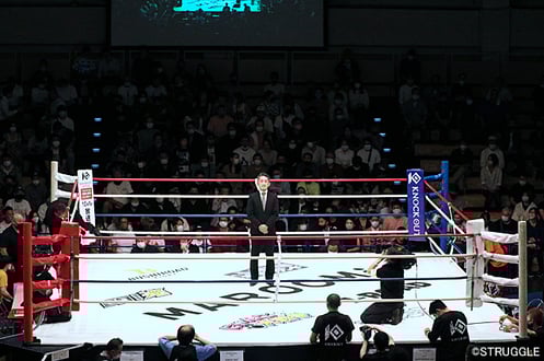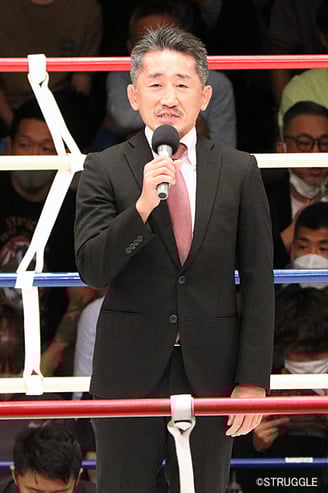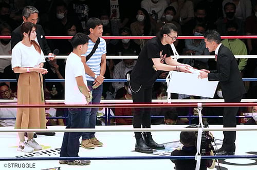 そんな真面目な松﨑氏、セレモニーではマスクは外してという話を聞いていたのですが、先にリングインした松﨑はそのままマスクを着けていて、下からマスクを手に持って振って『外して』というジェスチャーをしたら、下から手を振っていると勘違いしてこちらに手を振り返してくれました。