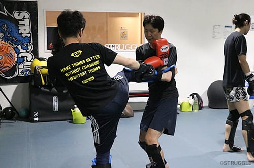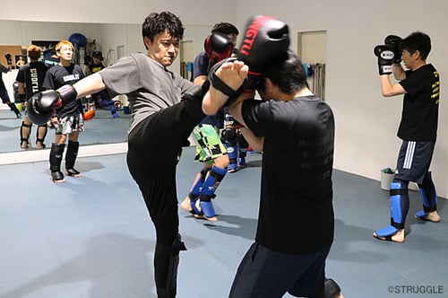 ミドルキックと同じ蹴り方だと上に上がってしまうので、骨盤や急所を蹴ったりしてしまいます。