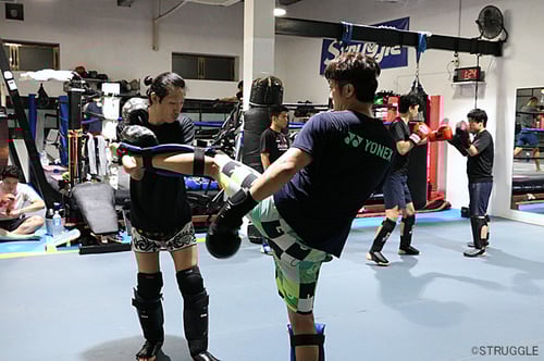 蹴り方がミドルキックとちょっと違って、まず大切なポイントは狙ったところにちゃんと当てること。
