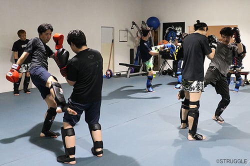 ある程度慣れたところで皆でローキック、ミドルキック、ハイキックで腕ブロックを用いての受け返しテクニック練習。