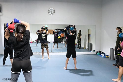 その後、アップがてらキックボクシングの基本技術をおさらいしながら皆で動きます。