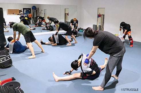 まずはパートナーストレッチで身体をほぐします。