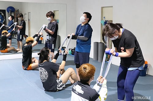 最後はトレーナー陣とタオルを使ったマンツーマン筋トレ。