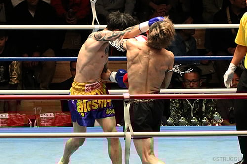 老沼はジュライ選手のプレッシャーをかけての攻めに下がって迎え打とうとした瞬間に、フェイントからのジュライ選手の縦肘打ちが直撃…。