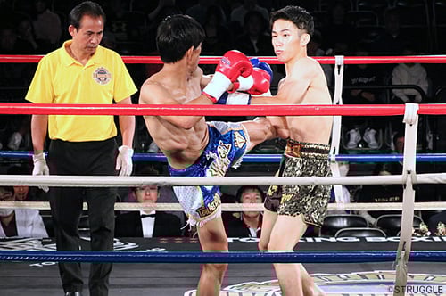 大河内選手もパンチに加え、回転蹴りなども繰り出して攻め込んできて、お互いが前に出て組んだりする接戦。