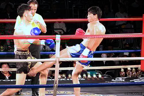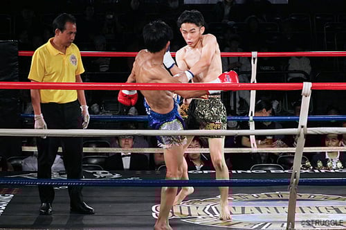 1R、開始から左ミドルキックを当てていく大﨑、そのミドルを受けてもすぐさまパンチの反撃からコンビネーションで返す流れの大河内選手。
