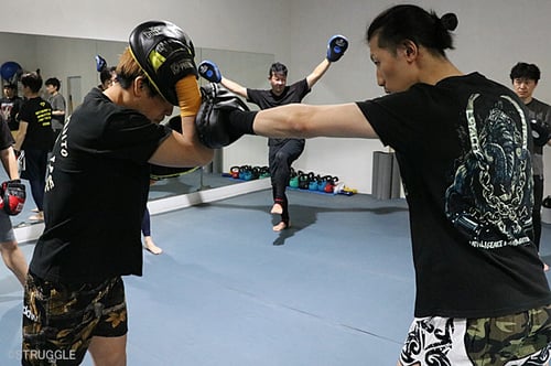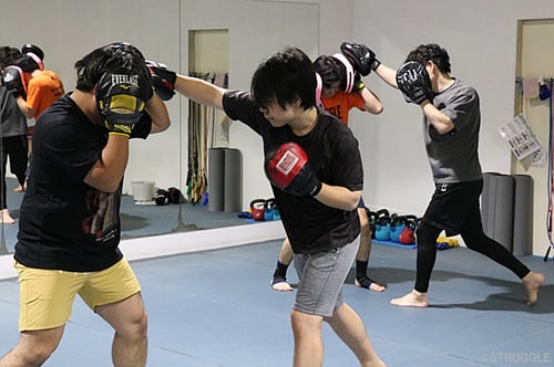 そして、パンチングミットでパンチのパーリングとブロッキングを練習しました。