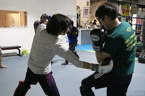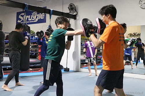 ワンツー、ストレート、フック、アッパーなどを織り交ぜて、4発、5発など一気に打つ連打を1発ずつ増やして、徐々にキレイに連続できるように行いました!