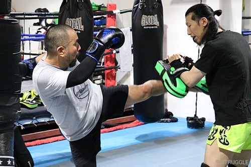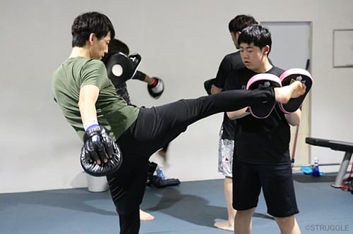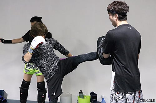 その後は前蹴りのアジャスト&フォームを重視して、足、腹など上手く蹴り分けてのミドルキックのフォーム練習。