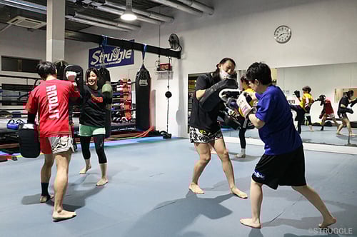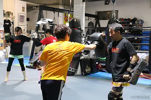 3人のトレーナー陣と先ほど練習したブロッキングなどを混ぜてのミット打ち。