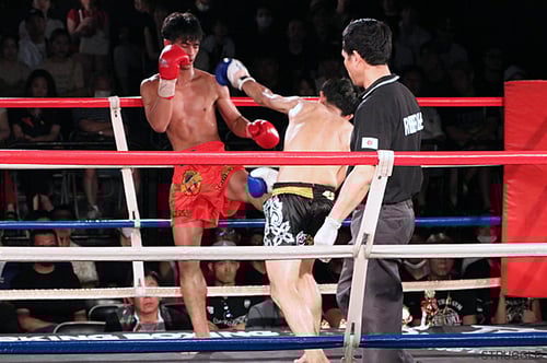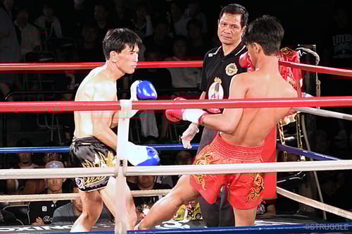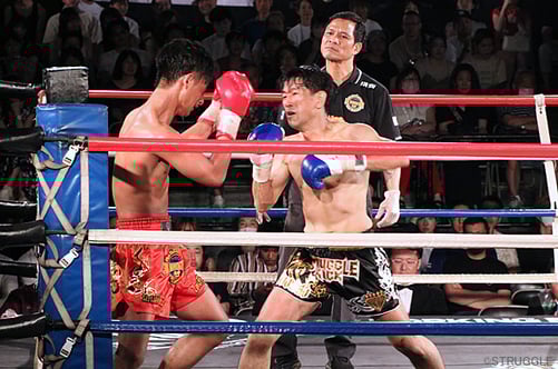 1Rしっかりと相対しようと向かっていく大﨑にイティポン選手が強襲のミドルキック。