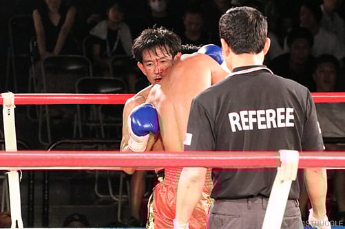 その後、再度組んでの肘打ちで出血し、ドクターチェック。