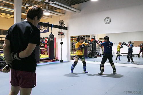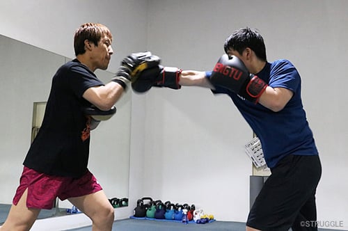 パンチが手打ちにならないように腰の回転や手の戻しなどをポイントに、キレイなストレート系パンチをスティックやミットで調整。
