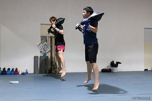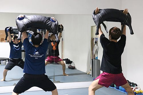 最後はブルガリアンサンドバッグでの基本3種目を一緒に行って終了!