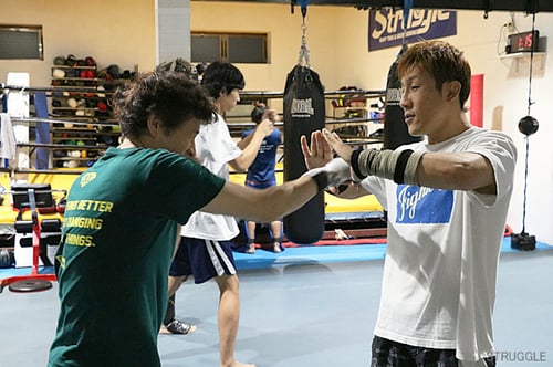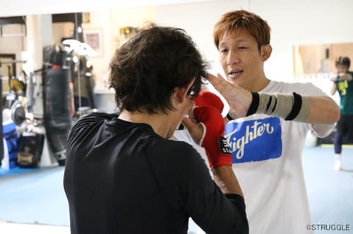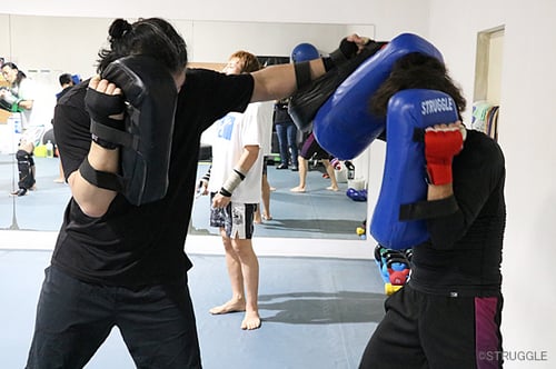 さらにミドルキックのミットの持ち合い、お互いにフォームの確認と打撃慣れのためにミットでのフック系の打ち合いもしました。