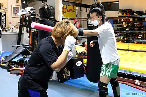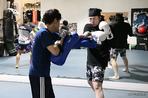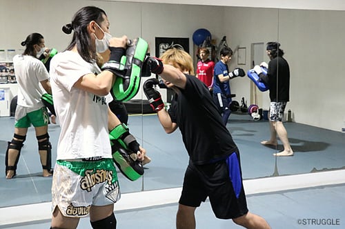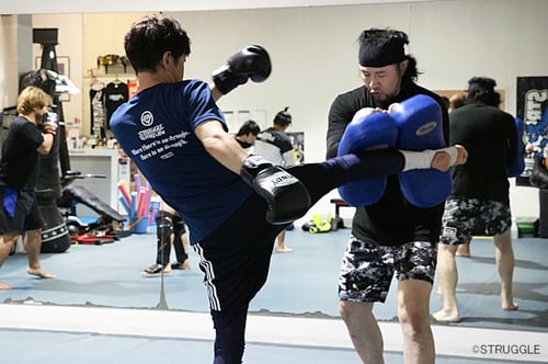 ミット打ちはミドルキックをパンチのディフェンスを織り交ぜて行いました。