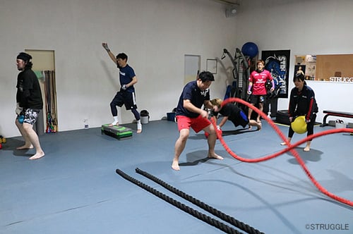 締めはヘヴィーロープ、ケトルベル、ステップ台などを使って、フィジカル強化のクロスフィットサーキットトレーニング!