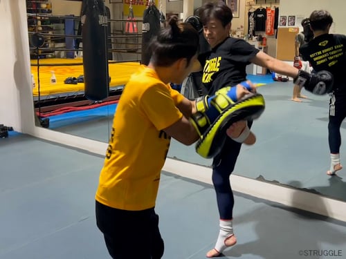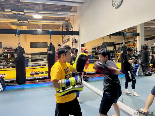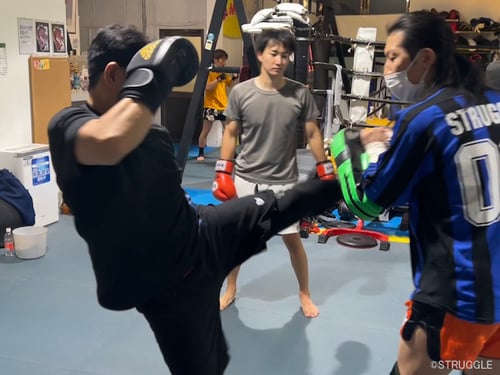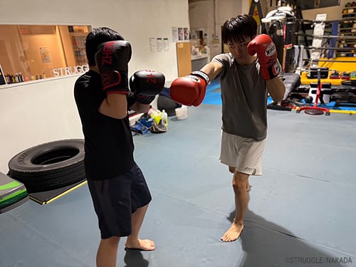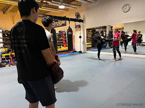 トレーナー陣とそれらの基本テクニックをミット打ちで反復練習。