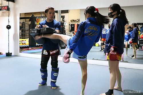 蹴りが当たった時に軸がしっかりとしていると良い蹴りになるので、最初は強く蹴ることよりも軸を意識してみると上達しやすいですよー。