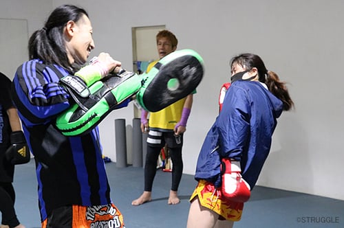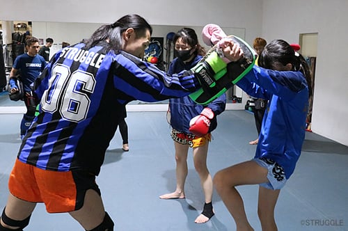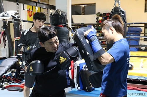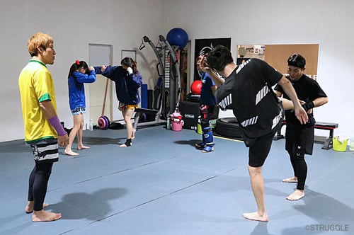 さらにミドルキックをキャッチしての反撃や、スウェーバックからの反撃も覚えてトレーナー陣と反復しました。