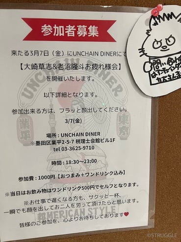さらに有志の方々が、押上UNCHAIN DINERさんで3月7日(金)18:30~23:00に老沼隆斗&大﨑草志お疲れ様会を行ってくださるそうです。