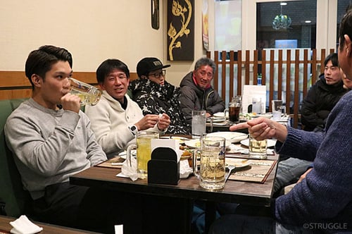 中田ユウジ、磯貝雅則の現役プロ選手に加え、同時期に共に日々頑張った仲間の松﨑公則、そして中向永昌、根津優太(所属は&moshですが共に練習し切磋琢磨した大切な仲間)も参加してくれて、自分は解説の仕事があり前半少しだけの参加となりましたが美味しいタイ料理を食べながらの楽しい時間でした!