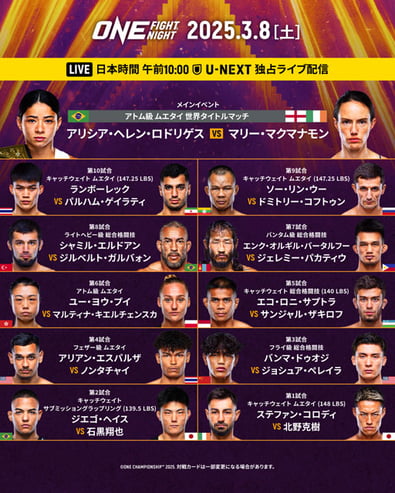 チャンピオンのアリシア・ヘレン・ロドリゲス選手が、2週間前に代打出場が決定したONE初参戦のマリー・マクマナモン選手の挑戦を受けて立つ防衛戦です。