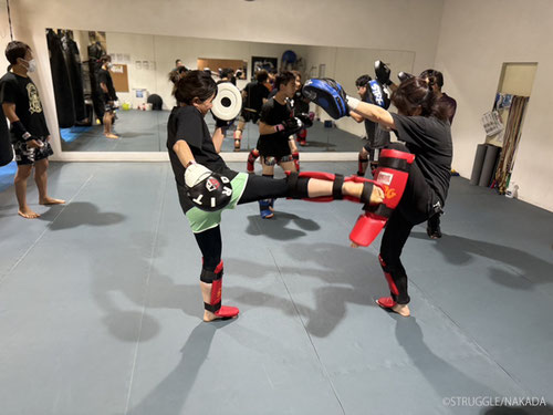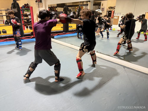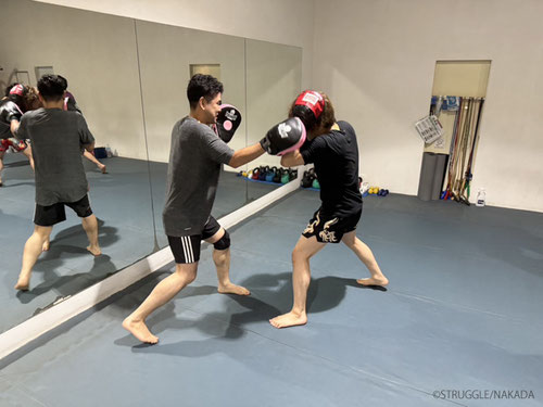この日は慣れた方が多かったので、パンチングミットとスネ当てでキャッチボール的な受け返し練習をしました。