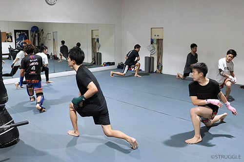 7月23日(水)のキックボクシング初心者クラスは簡単なストレッチから始めて、タッチゲームでディフェンス力アップ。