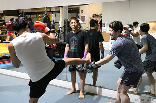 相手に蹴り足を掴んでもらってのミドルキックのフォーム練習。