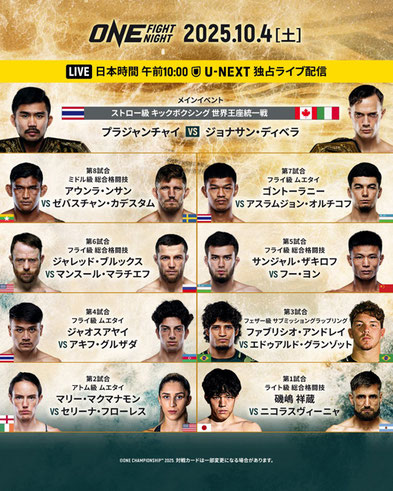 明日、10月4日(土)10:00からU-NEXTでライブ配信されるONE Fight Night 36の日本語解説を担当いたします。