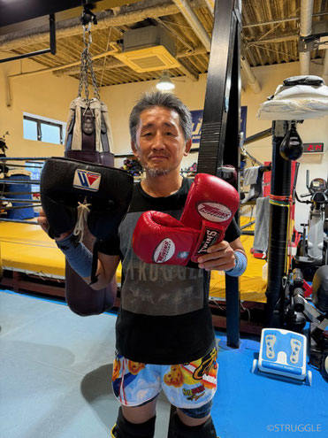現役時代に使っていたヘッドギアとパンチンググローブをジムに寄贈してくださいました。