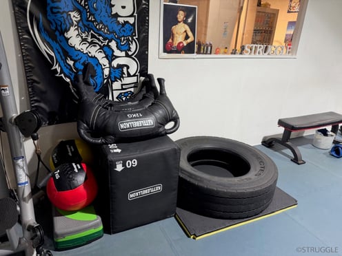 縄跳びのところにかけてあるケトルベルやブルガリアンサンドバッグなどの簡単なトレーニングガイドにタイヤ跳びの方法もあるので、是非やってみて下さ~い!