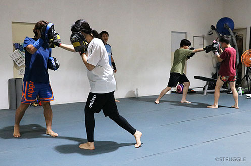そしてパンチングミットを使って、ゆっくりフォームを意識してそれらの技を練習しました。