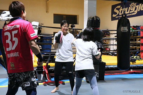 鏡の前でフォームとポイントを確認してから、パンチングミットを使ってミットの持ち合い。