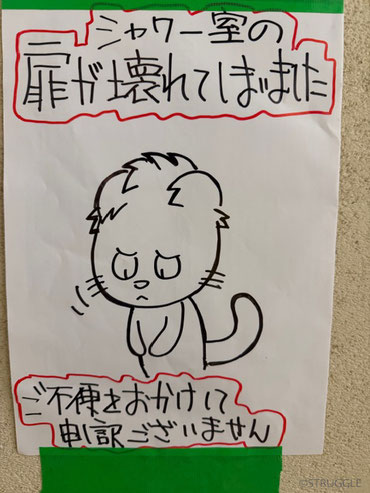 ジムのシャワー室の扉の下の部品が割れてしまい、昨日から扉がちゃんと閉まらない状況です。