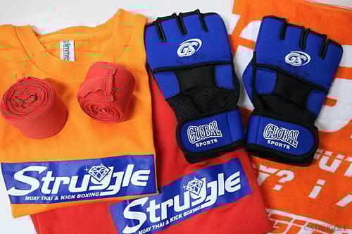 Tシャツ、ショートパンツ、タオル、バンテージ(巻くのが苦手な方は、拳部分にパットが入った手袋に変更します)のセットも500円でレンタルできます。