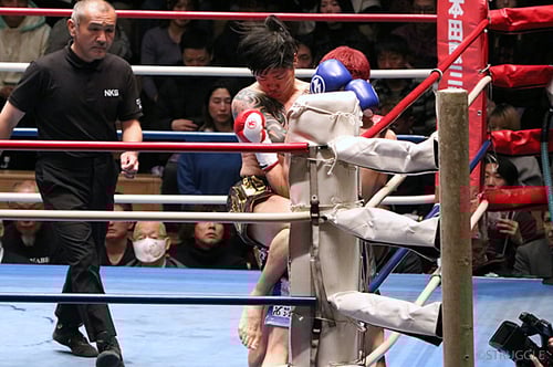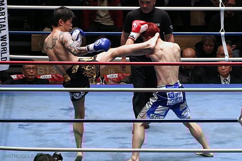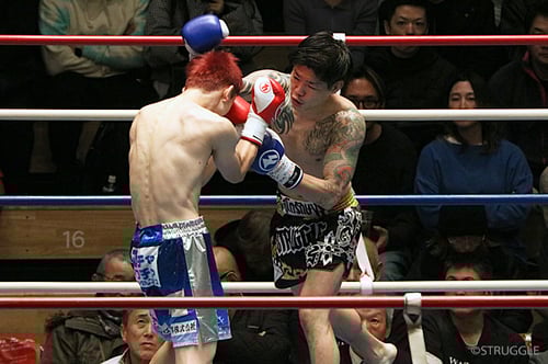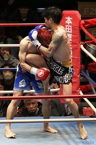 首相撲で膝を当てていき、肘打ちやハイキックで攻め続けて、ハタ選手も逆転のバックブローなどを繰り出してきますが、しっかりと避けてパンチを当てていきました。